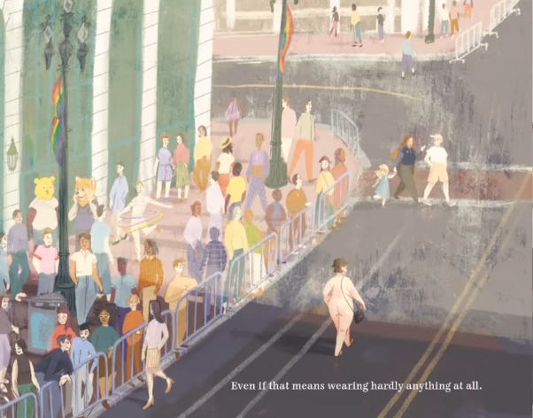 One page features a couple in leather bondage gear in the bottom right corner, with the caption: “Everyone is wearing whatever makes them feel like themselves.” Another page states, “Even if that means wearing hardly anything at all.”