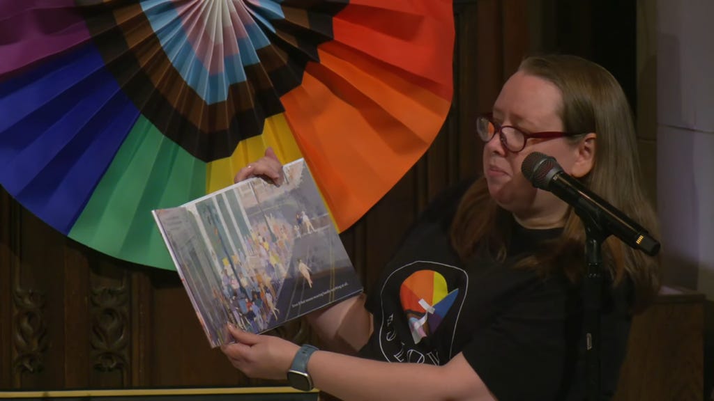 During a recent church service, Mary Toth, the Children’s Church Coordinator, invited the children to the front for storytime. She proceeded to read The Rainbow Parade by Emily Neilson, which tells the story of a young girl excitedly attending her first Pride parade.