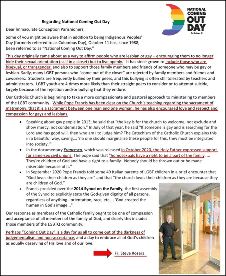 A few months later, he celebrated Mass for National Coming Out Day, where he urged parishioners to accept LGBTQ ideology and encouraged queer individuals to live openly without hiding their orientation.