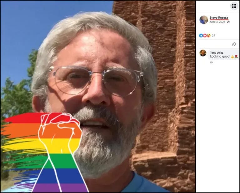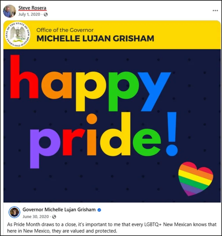 On July 1, 2020, Rosera shared Governor Michelle Grisham’s “Happy Pride” message, one of several pro-LGBTQ posts he disseminated.