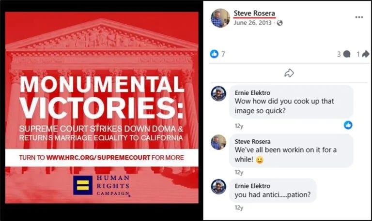 Two years prior to the dissolution of his homosexual relationship, Rosera made several Facebook posts in favor of the Supreme Court striking down the Defense of Marriage Act. In 2015, Rosera signed his name to an amicus brief in favor of Obergefell.