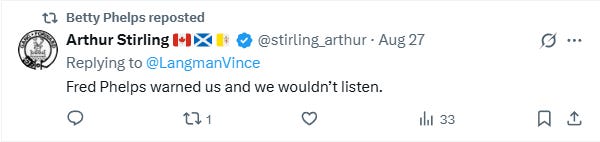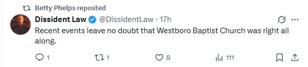 They are not very active on social media- being deplatformed from multiple sites, though one of the Phelps’ clan, Betty, continues to operate on X, reposting right-wing news and memes, along with tweets like this: