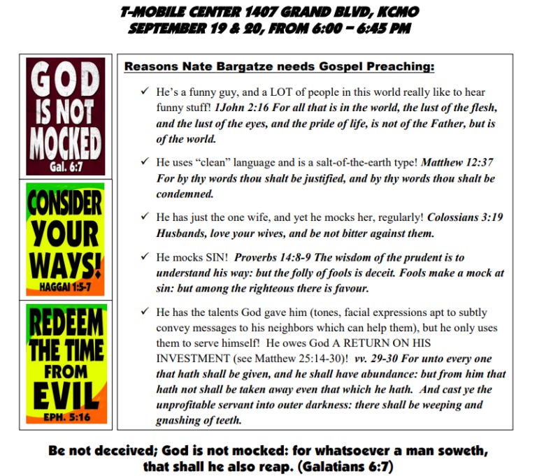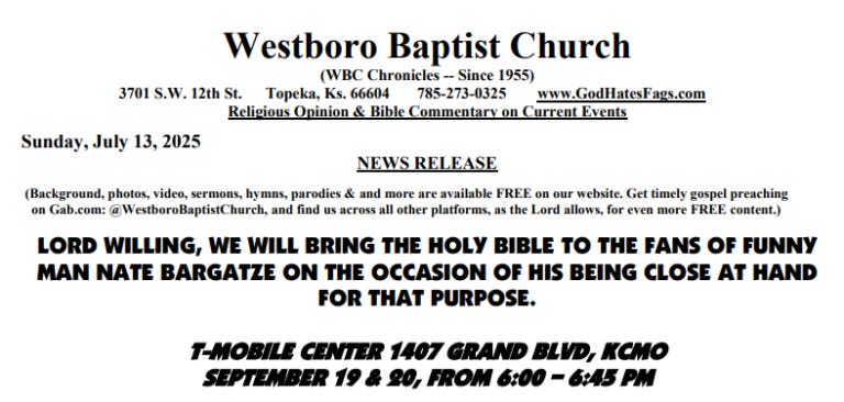 They also have two planned protests against Christian comedian Nate Bargatze, with one of their justifications being: “He has just the one wife, and yet he mocks her, regularly! Colossians 3:19 Husbands, love your wives, and be not bitter against them.”